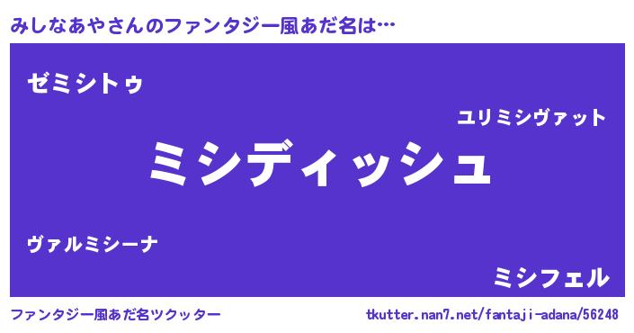 | 女子向けラノベタイトル風あだ名 | 『みしなあやの契約王妃』 |