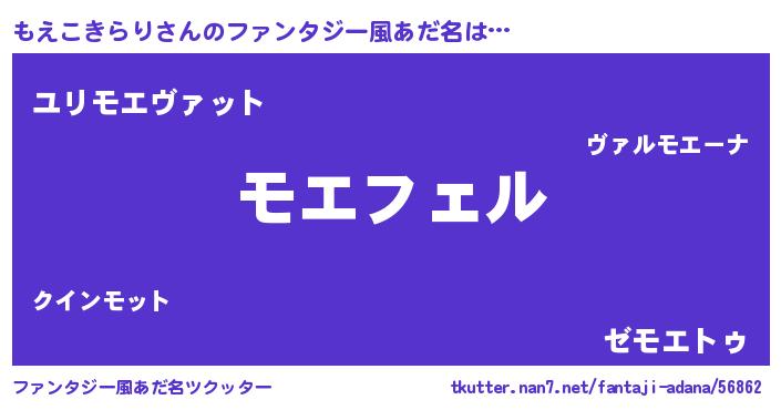 | 男性向けラノベタイトル風あだ名 | 『モエコキラリアートオンライン』 |