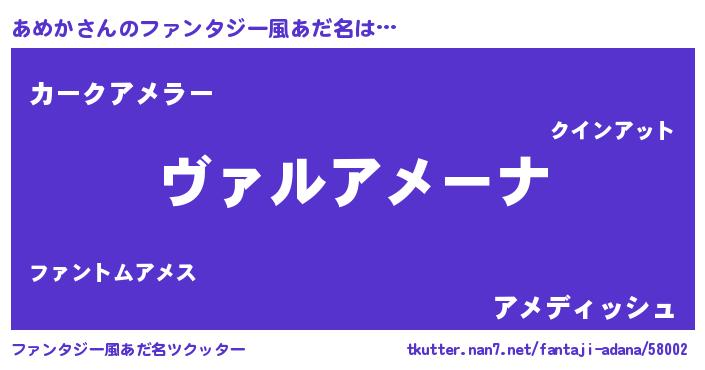 | 男性向けラノベタイトル風あだ名 | 『この素晴らしい世界にあめかを!』 |