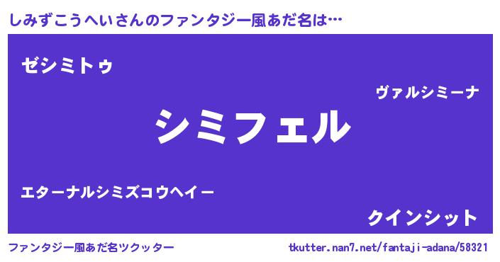 | 男性向けラノベタイトル風あだ名 | 『シミズコウヘイアートオンライン』 |