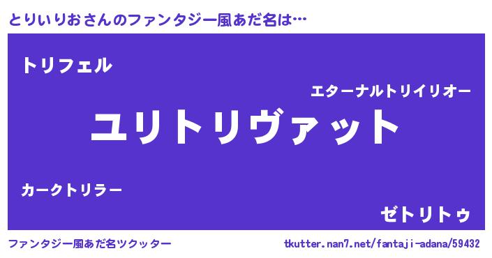 | 男性向けラノベタイトル風あだ名 | 『とりいりお~年齢イコール彼女いない歴の魔法使い~』 |
