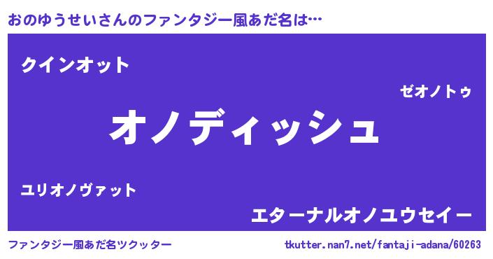 | 女子向けラノベタイトル風あだ名 | 『おのゆうせいの契約王妃』 |