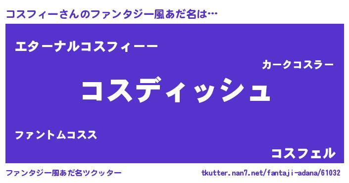 | 男性向けラノベタイトル風あだ名 | 『コスフィーという概念が存在しない退屈な世界 』 |