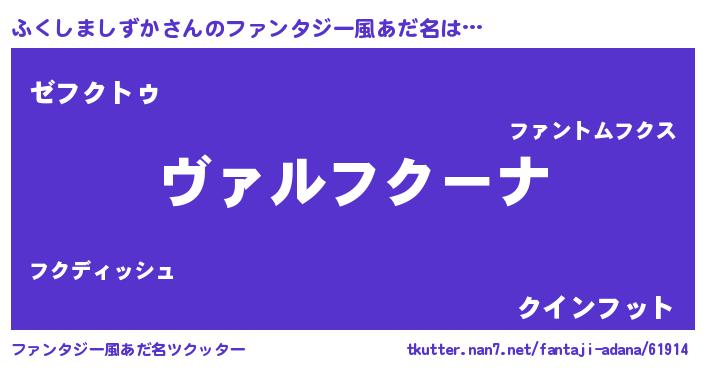 | 男性向けラノベタイトル風あだ名 | 『魔弾の王とふくしましずか』 |
