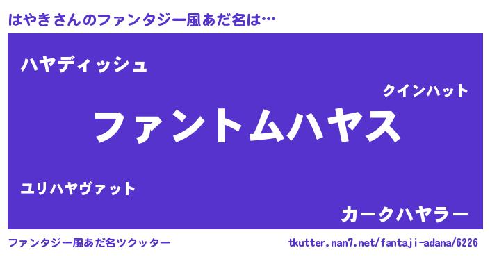 | 男性向けラノベタイトル風あだ名 | 『はやきの嫁は女の子じゃないと思った?』 |