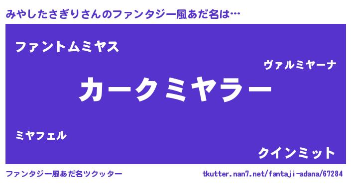 | 男性向けラノベタイトル風あだ名 | 『うちのみやしたさぎりが世界を掌握している!』 |