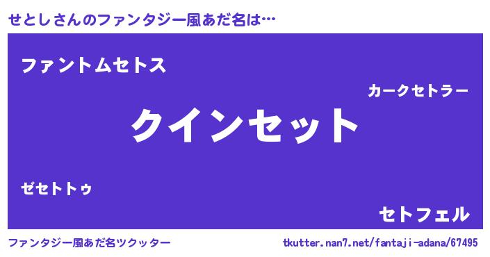 | 男性向けラノベタイトル風あだ名 | 『おまえをオタクにしてやるから、俺をせとしにしてくれ! 』 |