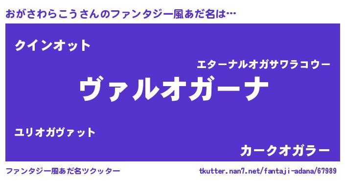 | 男性向けラノベタイトル風あだ名 | 『魔弾の王とおがさわらこう』 |