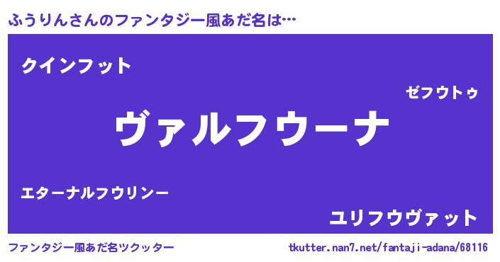 | 男性向けラノベタイトル風あだ名 | 『魔弾の王とふうりん』 |