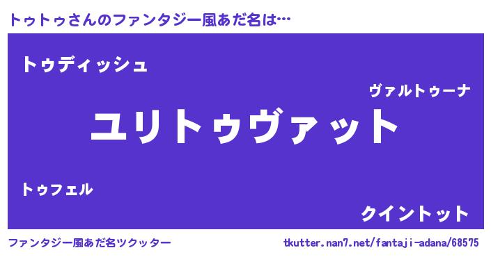 | 男性向けラノベタイトル風あだ名 | 『トゥトゥ~年齢イコール彼女いない歴の魔法使い~』 |