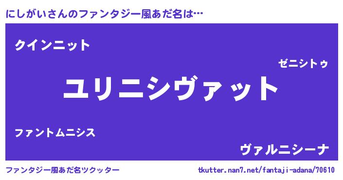 | 男性向けラノベタイトル風あだ名 | 『ニシガイスレイヤー』 |