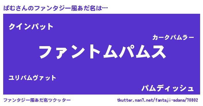 | 男性向けラノベタイトル風あだ名 | 『ダンジョンにぱむを求めるのは間違っているだろうか』 |