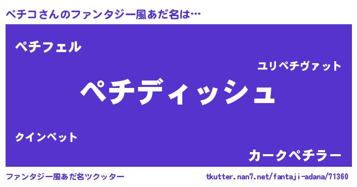 | 女子向けラノベタイトル風あだ名 | 『ペチコの契約王妃』『死神ペチコの再婚』 |