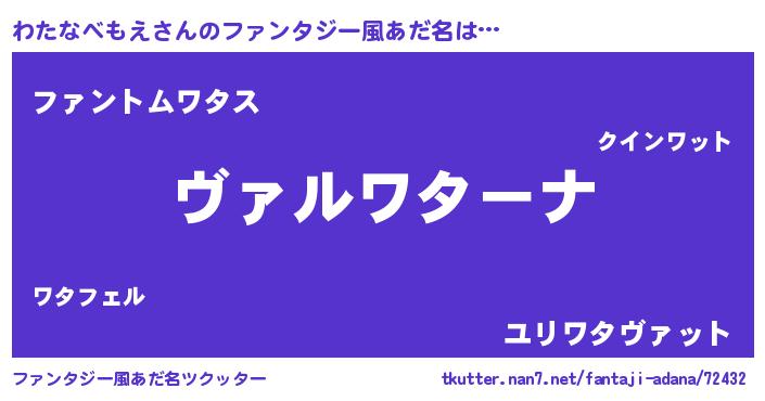 | 男性向けラノベタイトル風あだ名 | 『魔弾の王とわたなべもえ』 |