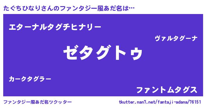 | 男性向けラノベタイトル風あだ名 | 『Re:たぐちひなりから始める異世界生活』 |