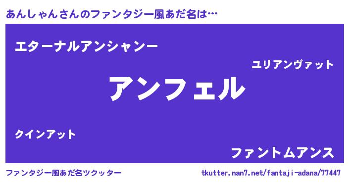 | 男性向けラノベタイトル風あだ名 | 『あんしゃんの憂鬱』 |