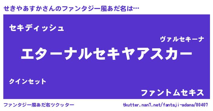 | 男性向けラノベタイトル風あだ名 | 『せきやあすかに滅ぼされるだけの簡単なお仕事です』 |