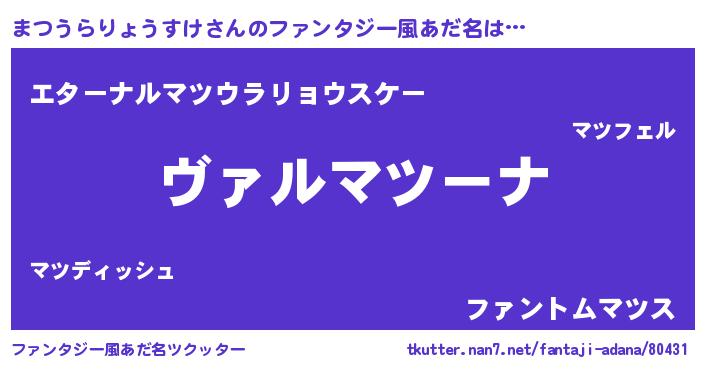 | 男性向けラノベタイトル風あだ名 | 『魔弾の王とまつうらりょうすけ』 |