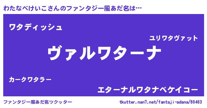 | 男性向けラノベタイトル風あだ名 | 『魔弾の王とわたなべけいこ』 |