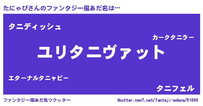 | 男性向けラノベタイトル風あだ名 | 『たにゃぴ~年齢イコール彼女いない歴の魔法使い~』 |