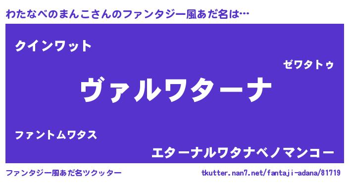 | 男性向けラノベタイトル風あだ名 | 『魔弾の王とわたなべのまんこ』 |