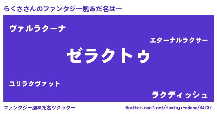| 男性向けラノベタイトル風あだ名 | 『Re:らくさから始める異世界生活』 |