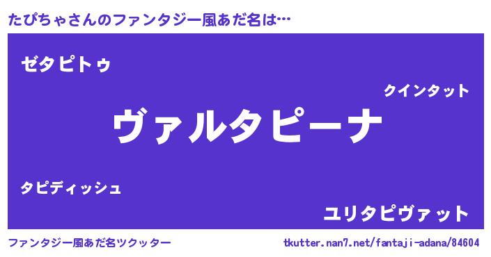 | 男性向けラノベタイトル風あだ名 | 『魔弾の王とたぴちゃ』 |