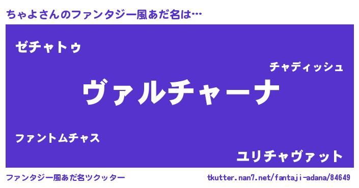 | 男性向けラノベタイトル風あだ名 | 『魔弾の王とちゃよ』 |