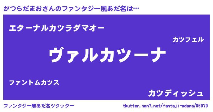 | 男性向けラノベタイトル風あだ名 | 『この素晴らしい世界にかつらだまおを!』 |