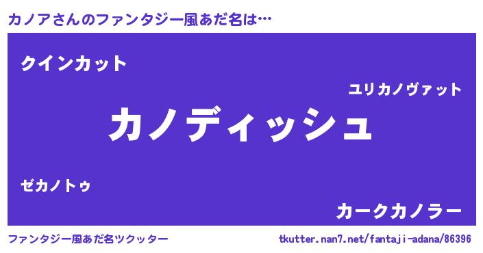 | 女子向けラノベタイトル風あだ名 | 『カノアの契約王妃』『カノア恋絵巻』 |