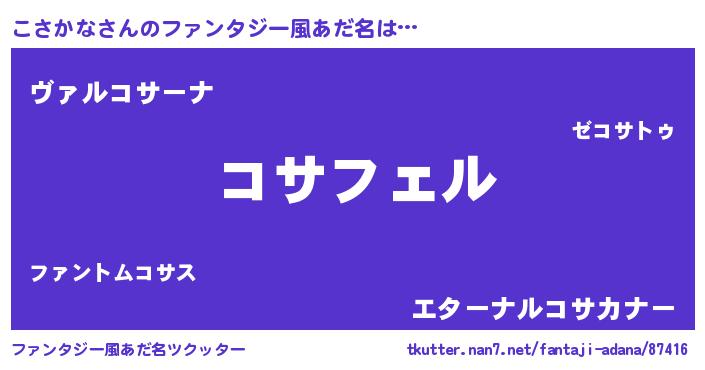 | 男性向けラノベタイトル風あだ名 | 『こさかなの憂鬱』『魔弾の王とこさかな』 |