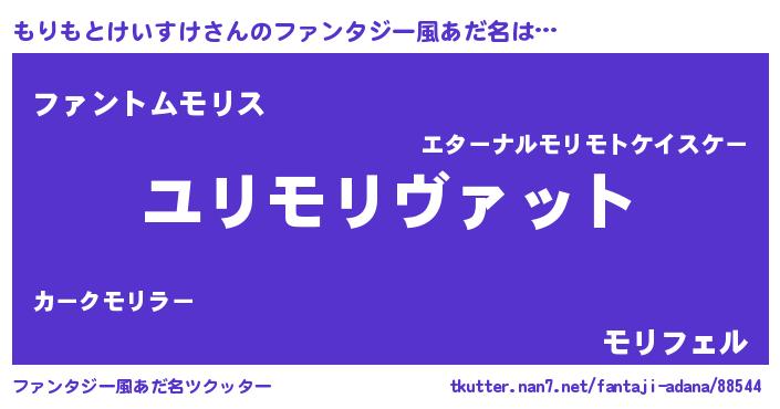 | 男性向けラノベタイトル風あだ名 | 『もりもとけいすけ~年齢イコール彼女いない歴の魔法使い~』 |