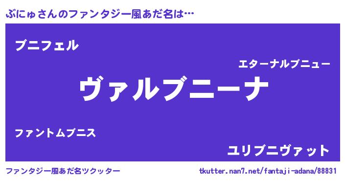 | 男性向けラノベタイトル風あだ名 | 『魔弾の王とぶにゅ』『ぶにゅの憂鬱』 |
