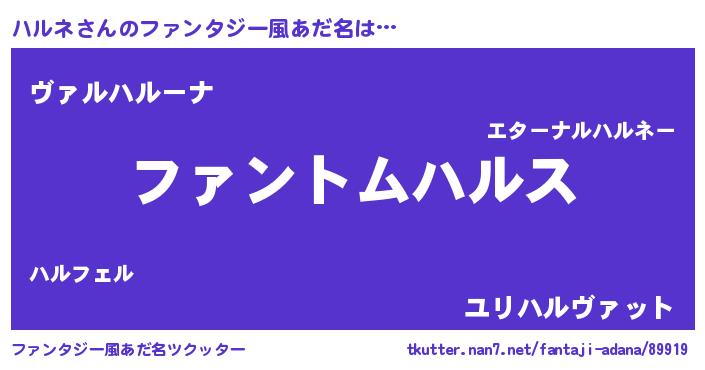 | 男性向けラノベタイトル風あだ名 | 『ハルネの嫁は女の子じゃないと思った?』 |