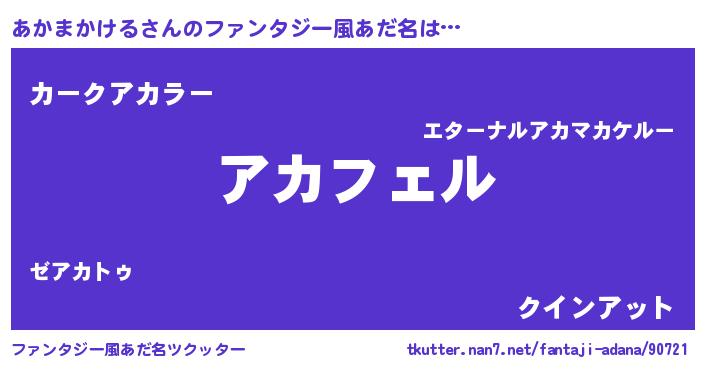 | 男性向けラノベタイトル風あだ名 | 『アカマカケルアートオンライン』 |