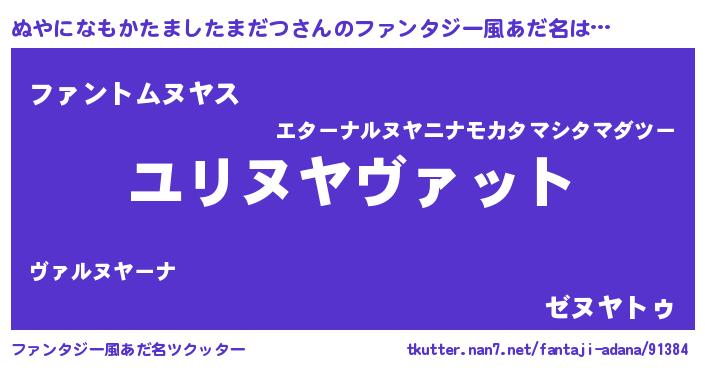 | 男性向けラノベタイトル風あだ名 | 『ヌヤニナモカタマシタマダツスレイヤー』 |