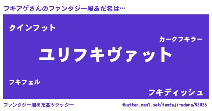 | 男性向けラノベタイトル風あだ名 | 『フキアゲ~年齢イコール彼女いない歴の魔法使い~』 |