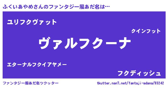 | 男性向けラノベタイトル風あだ名 | 『魔弾の王とふくいあやめ』 |