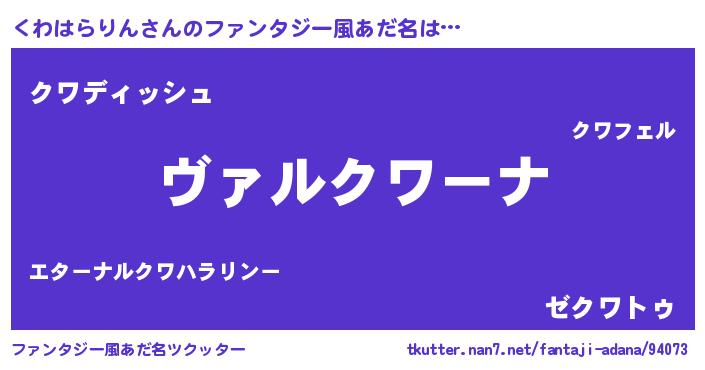| 男性向けラノベタイトル風あだ名 | 『魔弾の王とくわはらりん』 |