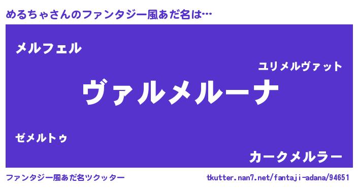 | 男性向けラノベタイトル風あだ名 | 『魔弾の王とめるちゃ』『めるちゃの憂鬱』 |