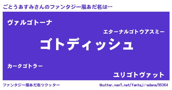 | 女子向けラノベタイトル風あだ名 | 『異世界で失敗しない100のごとうあすみ』 |