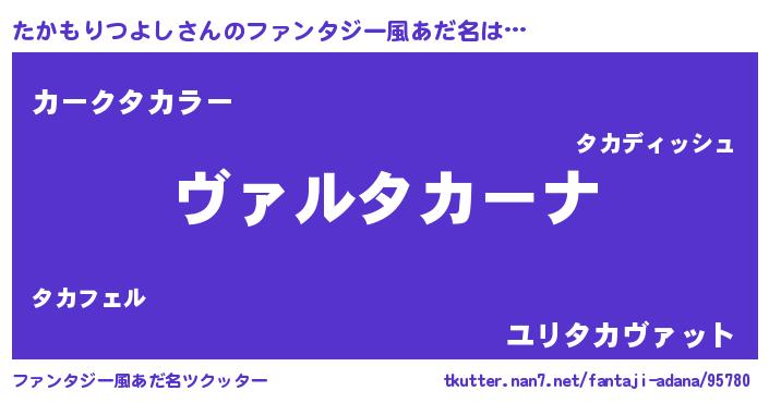 | 男性向けラノベタイトル風あだ名 | 『魔弾の王とたかもりつよし』 |