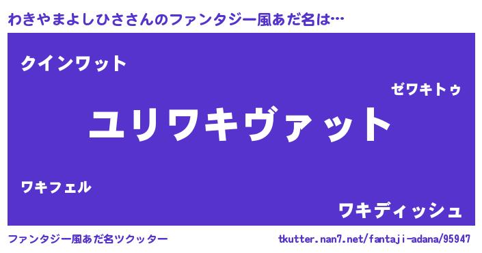 | 男性向けラノベタイトル風あだ名 | 『わきやまよしひさ~年齢イコール彼女いない歴の魔法使い~』 |