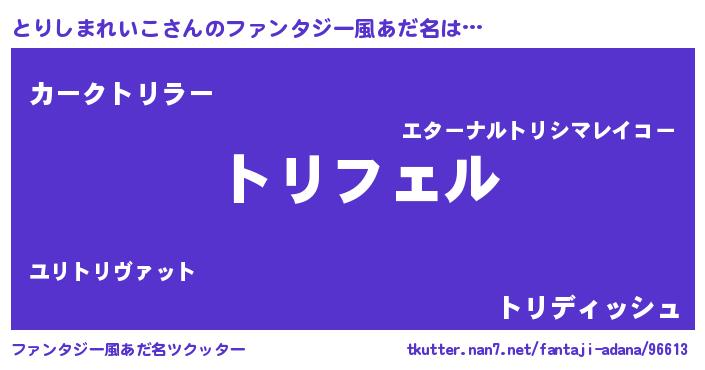 | 男性向けラノベタイトル風あだ名 | 『トリシマレイコアートオンライン』 |
