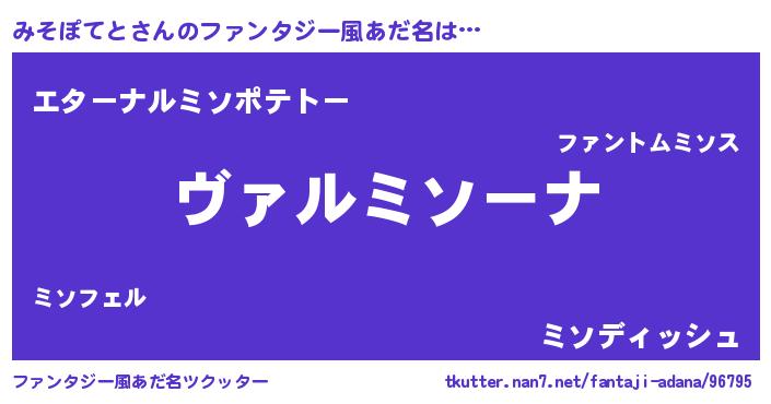 | 男性向けラノベタイトル風あだ名 | 『この素晴らしい世界にみそぽてとを!』 |