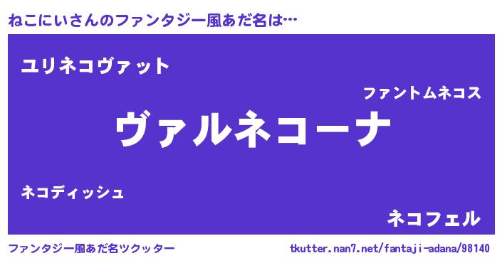 | 男性向けラノベタイトル風あだ名 | 『魔弾の王とねこにい』 |