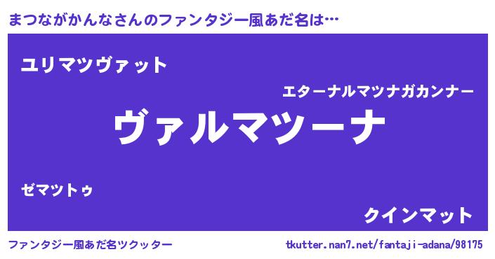 | 男性向けラノベタイトル風あだ名 | 『魔弾の王とまつながかんな』 |