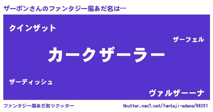 | 男性向けラノベタイトル風あだ名 | 『緋弾のザーポン』『魔弾の王とザーポン』 |