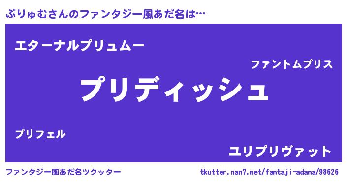 | 男性向けラノベタイトル風あだ名 | 『ぷりゅむという概念が存在しない退屈な世界 』 |