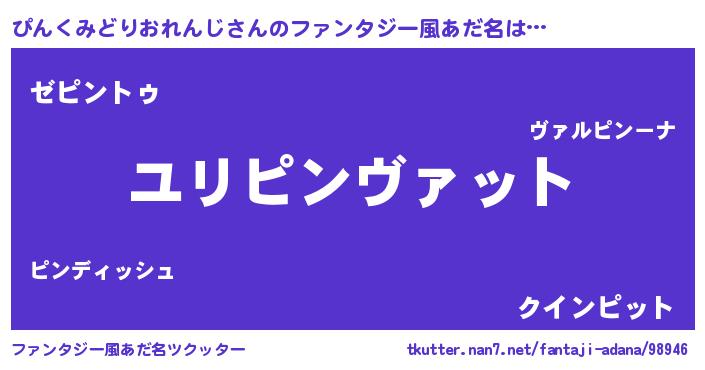 | 男性向けラノベタイトル風あだ名 | 『ぴんくみどりおれんじ~年齢イコール彼女いない歴の魔法使い~』 |